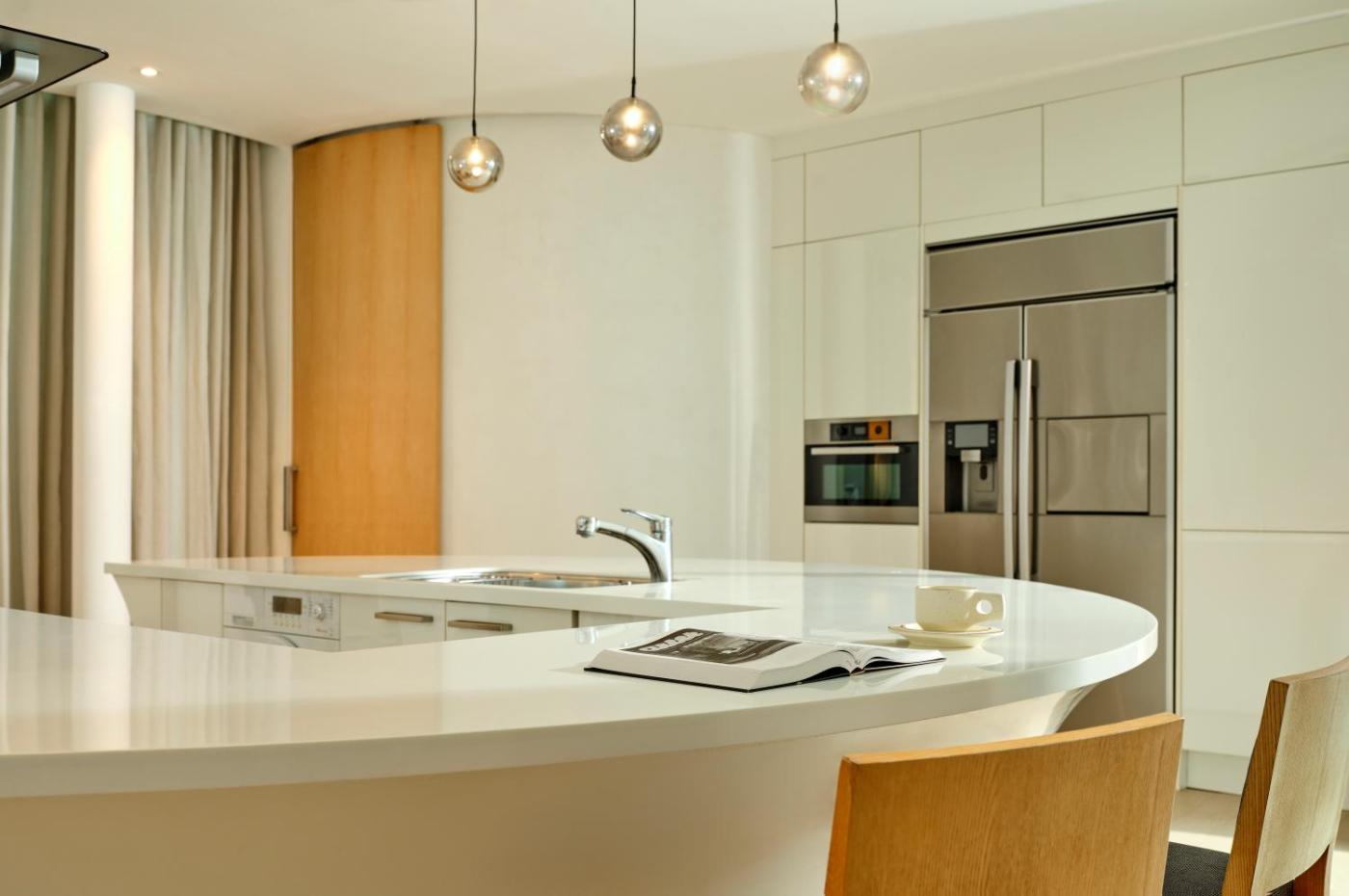 Dominique Perrault - 74 Type (3 Rooms). This luxurious 3-bedroom villa features design inspired by the paddy fields and waterfalls of Jejus landscape. Designed by Dominique Perrault, it comes with a scenic pond, a kitchenette and a living room. En suite bathrooms have spa bathtubs. ;